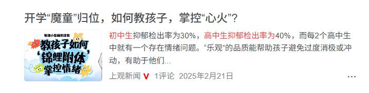 《2023年度中国精神心绪健康》蓝皮书阐显着示,小学生的抑郁检出率为10%,初中生抑郁检出率为30%,高中生抑郁检出率为40%,而每2个高中生中就有一个存在激情问题。