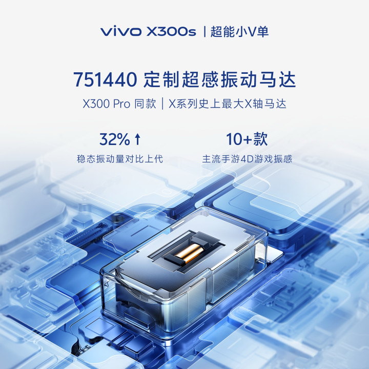 vivo X300s不单是是影像旗舰,拿来玩游戏和当主力机齐是极好的聘请:机身内置1511战饱读人人对称双扬声器Pro,搭配iQOO15同款超感游戏音域,让听声辨位愈加简易和容易。还有751440定制超感振动马达,这块马达属于行业第一梯队,亦然X系列历史上最大最强的线性马达,现在也曾撑持10余款主流游戏的4D游戏振感。vivo X300s大幅提高了电竞体验,比如Monster超核引擎和电竞信号全家桶,还有超声波指纹识别2.0和USB3.2Gen1等等。