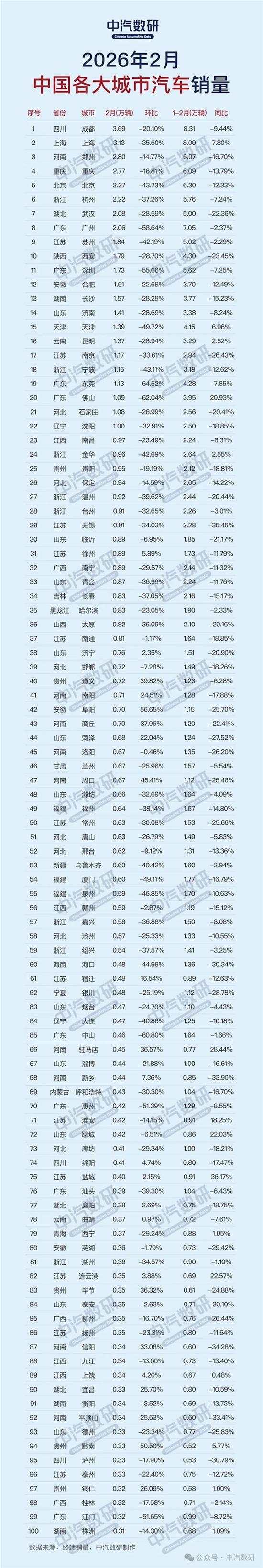 快科技音问,中汽数研本日发布了2026年2月各大城市汽车销量top100榜单。