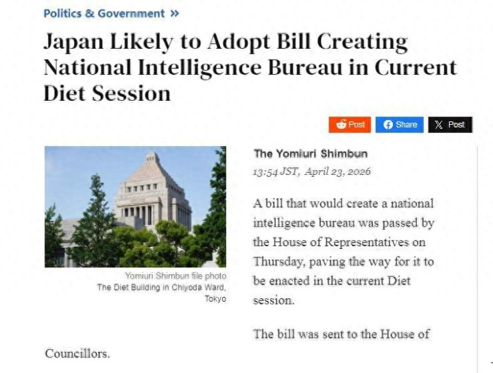 北约代表团刚走,4月23日,日本众议院通过了建设“国度谍报局”法案,内阁官房主座木原稔24日在记者会上阐明,预测将在本届国会内完缔造法。证据法案内容,建设“国度谍报会议”和“国度谍报局”——前者以首相为主席,成员包括内阁官房主座、外务大臣、小心大臣等核心阁僚,后者被赋予对各政府部门谍报职责的全面概述协调权。依照官方证明注解,它是为顾惜所谓“不实及诞妄信息”、远隔异邦势力“纷扰选举”和“操控公论”。但这些表述把方针完全指向了外部。