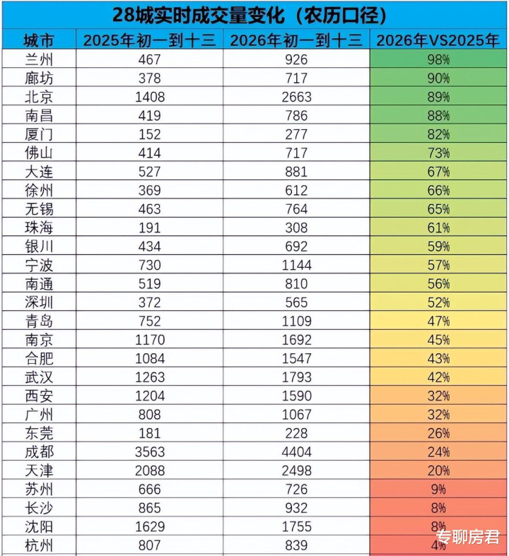 阐述楼市日期统计,2026年正月月朔至十三,天下28个要点城市及时成交量同比2025年同时上升39%。