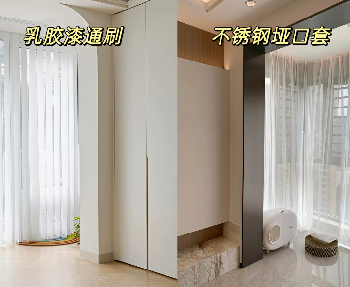 听劝就选∶乳胶漆通刷/不锈钢哑口套,乳胶漆通刷举座极简干净,老本低、施工快,极简风不错装不锈钢哑口套,举座历害呼应,高等感弥散。