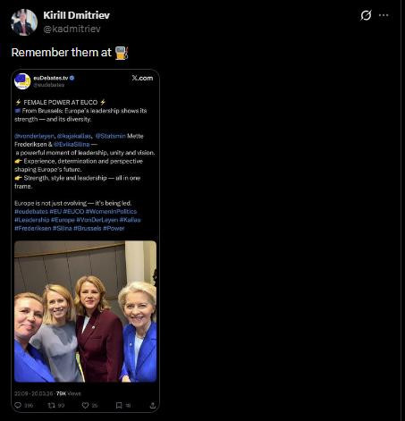 他还张贴了一张欧盟委员会主席冯德莱恩和欧盟酬酢与安全策略高档代表卡拉斯等东谈主“同框”像片。“在加油站时,要牢记这些东谈主。”他写谈。