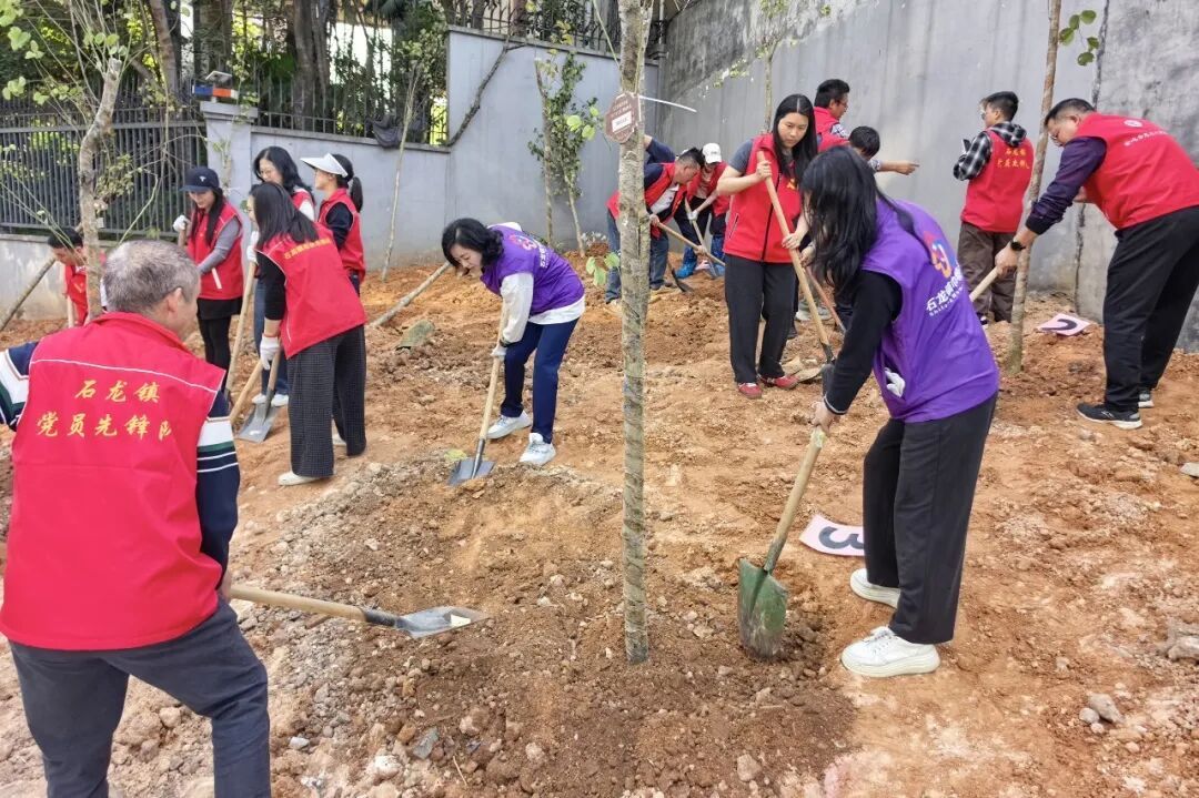 △兴龙社区聚拢石龙镇各机关单元、参与认捐的共建单元、石龙新阶联、企业商家代表及社区党员等开展植树举止