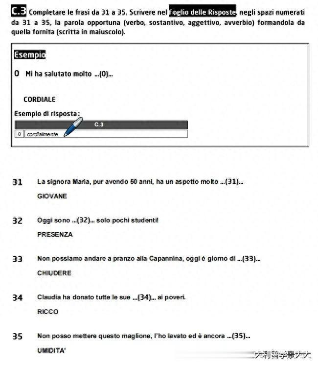 题设解析:条款将所给词休养成顺应神态(动词、名词、刻画词、副词),并以大写 in maiuscolo神态填写在答题卡相应的位置。