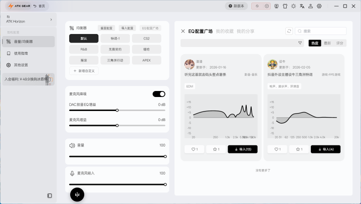 它还有抓续更新的专科游戏调音库,以及玩家共创的调音社区,能奏凯套用大神共享的 EQ 有狡计,哪怕是调音小白,也能疏忽找到最合乎我方的听感。