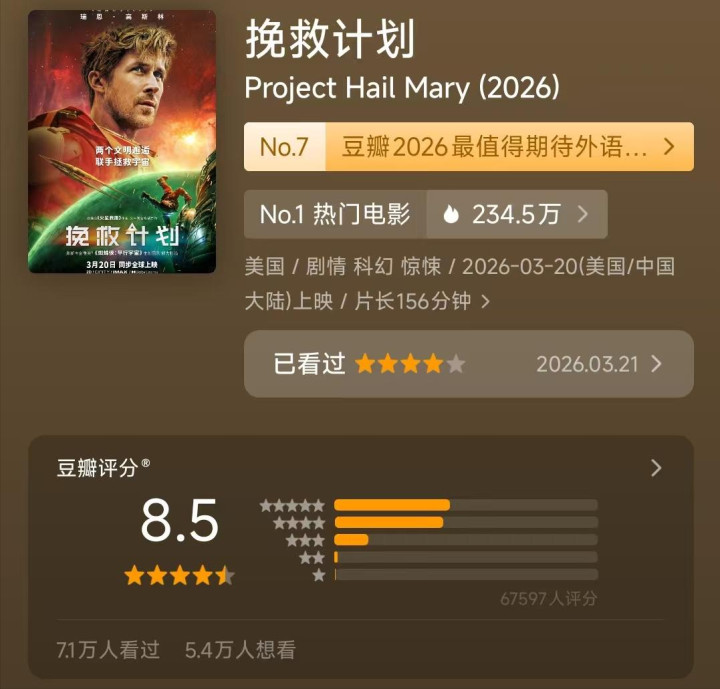 由《火星支持》(原名《Project Hail Mary(万福马利亚研究)》)原文章者安迪·威尔演义改编的同名影片《挽救研究》同步北好意思上映。