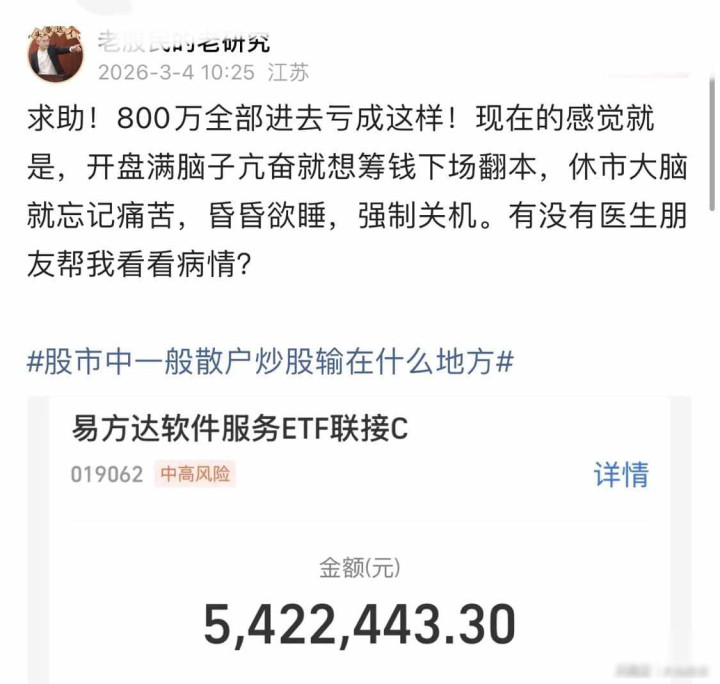 3月4日,有位江苏网友发帖说,我方账户亏了73.7万,一天就跌掉18.4万,他本金有800万,目下快没了,还贴出截图,数字清皎皎白,不是段子也不是夸张,开盘前他还筹钱准备翻本,厚谊挺高,收盘后就径直躺床上昏睡,手机也关机,这不是宽泛紧张,是东说念主被反复打击之后那种本能的避开响应。