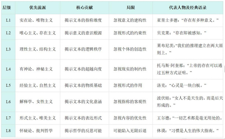 {jz:field.toptypename/}基于上述八阶框架,咱们对49个“宗旨/论”进行系统性定位。每一片系的本质特征,被重新描述为“对某一层级的优先关注,以及对其他层级的相对漠视”。在此经过中,咱们引入各派系代表东谈主物的经典发达,以揭示其中枢护理。