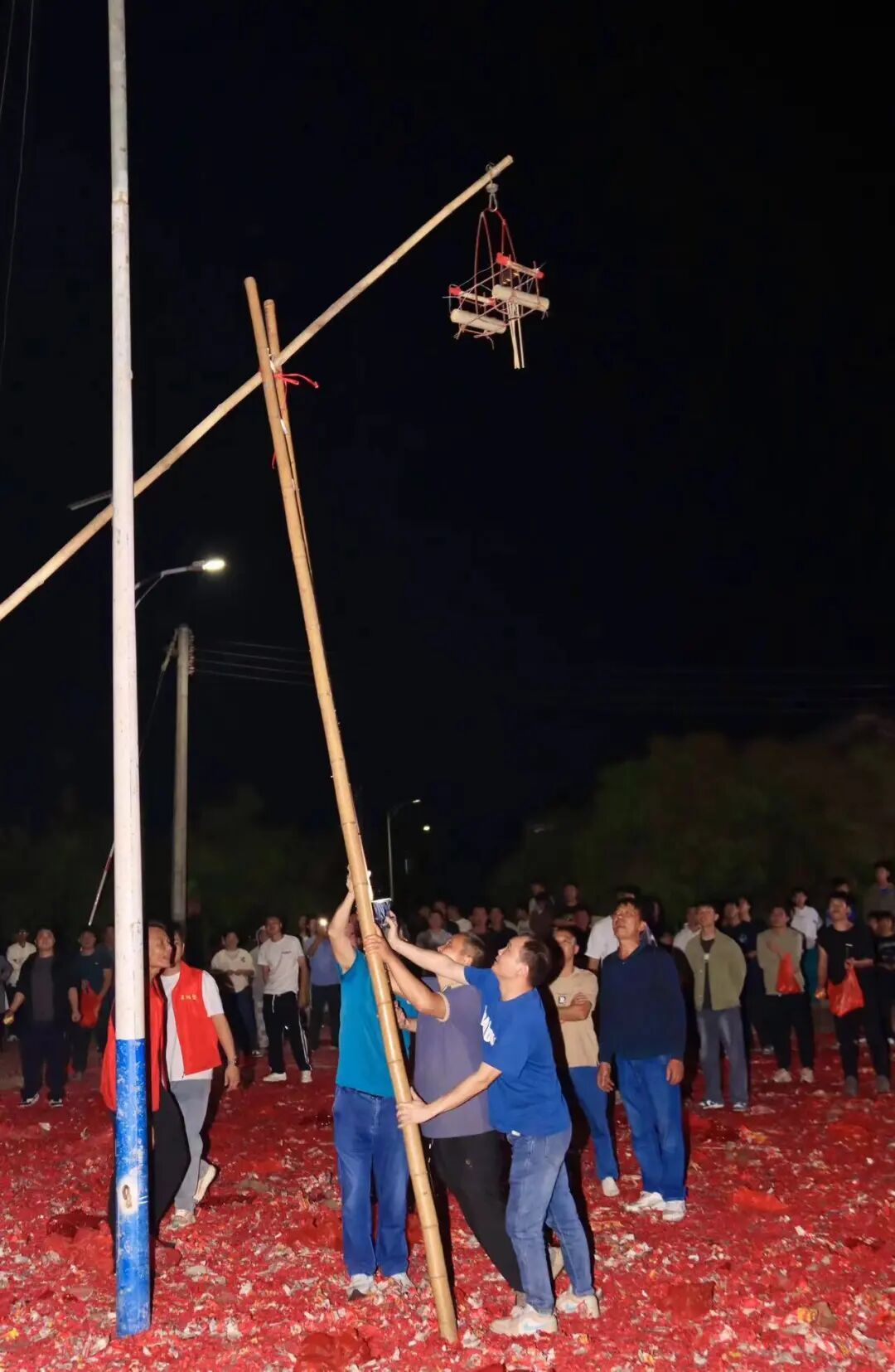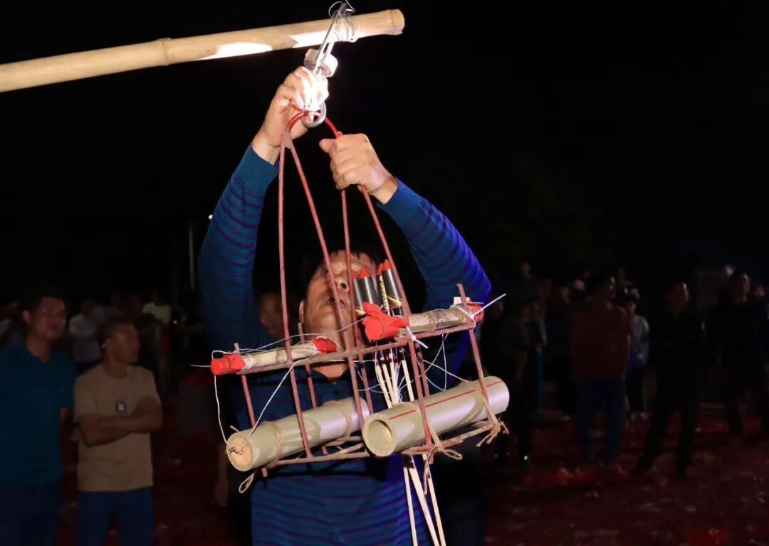 跟着主握东谈主一声令下,掷彩门举止精良拉开帷幕。年青小伙们手握焚烧的鞭炮,戮力将鞭炮抛向高空的彩门。火花划破静谧夜空,答应声、鞭炮声此伏彼起、响彻屯子。